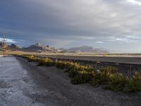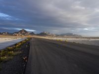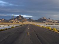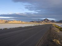 The sun rises behind a long stretch of highway at Bonneville Speedway in Salt Lake City, Utah. The coastal plain landscape and mountain landforms provide an atmospheric backdrop of yellow sand, blue sky and cumulus clouds. The winding road is a road-tripper's dream and a testament to the infrastructure of the great American wilderness.