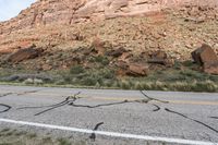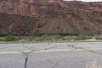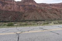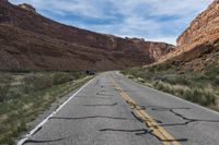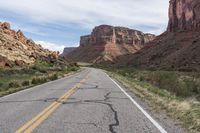 A straight road stretches through the red rocks of the desert, surrounded by mountains and untouched wilderness.
