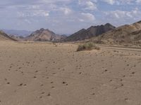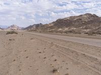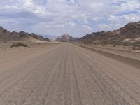 A straight road stretches endlessly through the sandy desert landscape of South Africa, with mountains in the background and a clear blue sky above.