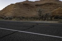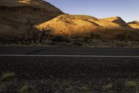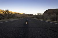 Scenic landscape with vegetation, mountains, and clear sky in North Wash, Utah. The road surface stretches endlessly, surrounded by red rock formations and sandthrax. A perfect dawn view of the natural environment.