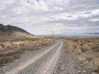 The winding road of Salt Lake City, Utah, USA, stretches out with an endless view of the dryland and farm fields, with a grey sky, mountain landforms, and a transmission tower in the background. The asphalt thoroughfare, surrounded by grass and vegetation, follows the curves of the valley as it winds its way through the natural environment and rural landscape.