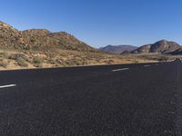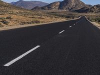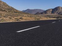 A scenic view of an endless road winding through the highlands of South Africa, surrounded by a beautiful desert landscape and mountain range. The road surface is covered with asphalt, lined with vegetation and trees, creating a captivating rural scenery. The clear sky and brown grass surface enhance the natural environment and horizon formation.