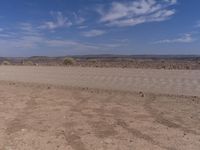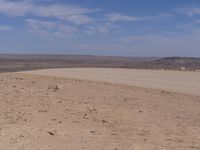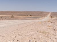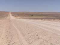 An endless road stretching across the vast landscape of South Africa, surrounded by brown sand, mountains, and clear blue skies.