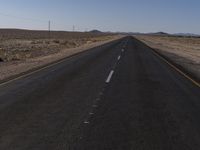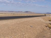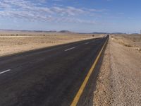 A straight road stretches endlessly through the African desert landscape in South Africa under a clear sky.
