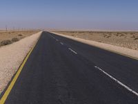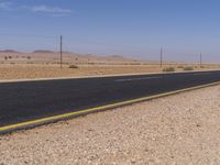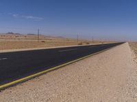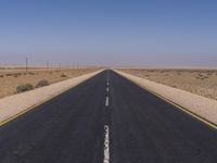 An endless road stretches across the South African landscape, surrounded by the vast desert and clear blue skies.