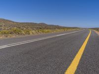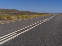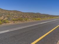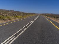 A long asphalt road cuts through the vast desert landscape of South Africa, with clear blue sky and sparse vegetation.