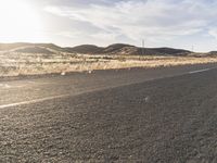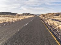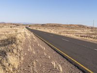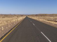 An endless road stretches through the South African desert landscape, with a clear sky and mountains in the horizon. The brown asphalt road surface is surrounded by vegetation and tints of shades from the highland slopes, creating a captivating view.