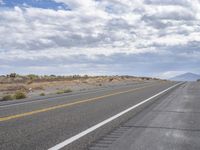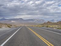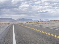 A straight, two-lane highway stretches out across the rugged landscape of the American highland, surrounded by yellow plains and grey mountain landforms. The asphalt road surface, with its shoulder and lane, beckons for a road trip through the natural environment and geological badlands of Utah.