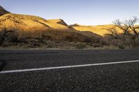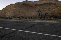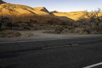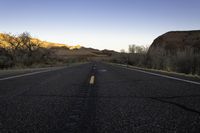 An endless road winds its way through the stunning red rock mountains of Utah, USA, at dawn. The barren desert landscape is dotted with sparse vegetation and surrounded by clear blue skies. The asphalt road surface stretches towards the horizon, leading to the majestic canyonlands and highland terrain. The natural environment of North Wash and Sandthrax can be seen in the distance, with grass and woody plants lining the road. The sun casts a warm light on the mountains, highlighting their unique profile and grey bedrock. A picturesque scene of nature and infrastructure in the heart of Utah.