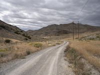 A stretch of gravel road winds its way through the vast Utah wilderness, past mountains, grassy steppes, and highlands. With a grey sky overhead and an electricity transmission tower in the distance, this is an endless expanse of natural environment leading to the city of Salt Lake City.