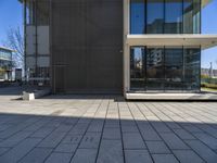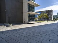 A modern condominium building in Lisbon, Portugal, surrounded by trees, clouds, and public spaces. Sunlight illuminates the flooring, asphalt road surface, and composite material facade creating a unique urban design with hard shadows and open spaces.
