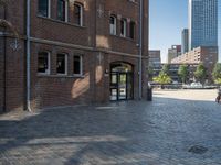 A dawn view of a residential area in the Netherlands showcases a combination of classic and modern architecture, with cobblestone roads, high-rise buildings, and lush vegetation in the background.