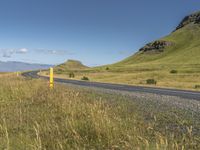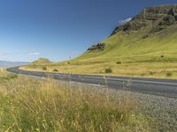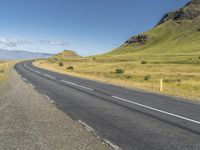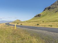 A road winds through a highland landscape of grass, trees, and vegetation in Iceland. The road's surface of asphalt, dirt, and gravel is illuminated by the bright sunlight and crystal clear sky.