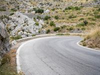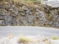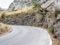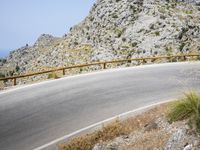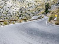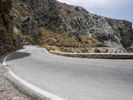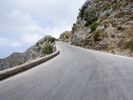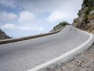 An overview of a coastal highway winding through the rugged terrain of Spain's Balearic Islands, with a clear sky and mountainous landforms in the background. The asphalt road surface curves and switchbacks past an Armco barrier and guard rail, amidst the winter trees and vegetation of this natural wilderness.