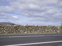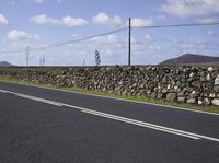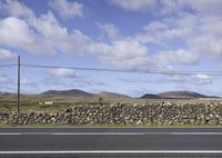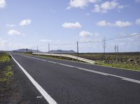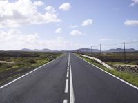A lone armco barrier stands in the middle of a seemingly endless asphalt highway in Fuerteventura, Spain. The rural landscape stretches out to the horizon, with lush green grass and wild vegetation, rolling hills and mountain landforms, and even a volcano in the distance.