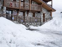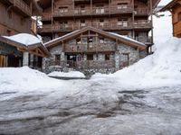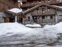 The classic architecture of a residential home in the suburbs of France is illuminated by the sun on a winter day in the Alps. Tourists and skiers enjoy the open space and wet surfaces of the road, mountain, and water in the area.
