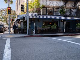In the heart of Los Angeles, California, the urban landscape is a lively mix of classic architecture and modern storefronts. Asphalt roads weave through the city, lined with hydrants and restaurants that buzz with day-to-day activity. Under clear skies, the profile of this vibrant city is defined by its unique blend of the old and new. Bars, shops, and urban charm create a captivating experience in one of the USA's most dynamic metropolises.