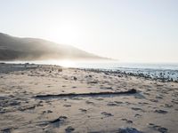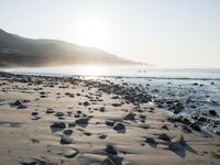 A breathtaking view of the Sahara desert with its ancient archaeological sites, badlands, rock formations, and lighthouses, as the sun rises over the horizon. The landscape is dotted with a winding road, boardwalk, bridge, and walkway, with a calm ocean and beach in the backdrop.
