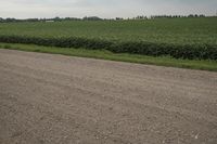 A winding dirt road stretches across a prairie field in Bancroft, Iowa, surrounded by a grey sky and the colors of farmland, soil, and grass. Agriculture and crop plantations are dotted along the path, reminding us of the rural beauty of America.