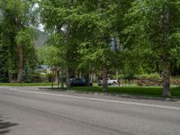 a road and trees line a residential street in a residential area in a neighborhood with no parking