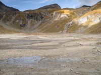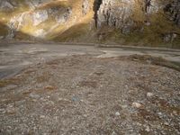 A track of dirt and gravel leads the way through the rugged landscape of Austria, with a backdrop of clear sky and mountain peaks on a sunny day.