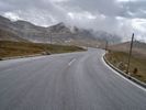 A winding road with an S-curve curves through the open landscape of Austria, with mountains in the backdrop and cloudy skies overhead. This rural road perfectly captures the beauty of this European country.