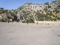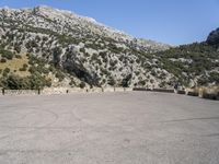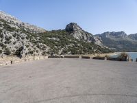 A road winds through the Balearic Islands of Mallorca and Spain, passing through grassy fields, rocky formations, and ancient architecture. The open landscape is filled with trees, cliffs, and mountains, while an Armco barrier provides safety for travelers.