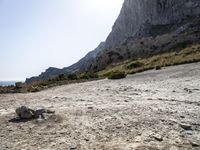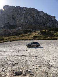 An Infiniti QX70 off-roading in the Mallorca region of the Balearic Islands in Spain. The landscape here is defined by its rugged terrain, coastal cliffs and mountains, with a mix of sand, bedrock, soil, and trees. The clear sky and wild nature make this an ideal place for exploration.