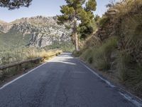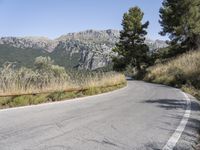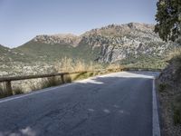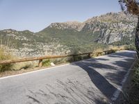 A winding road curves through the Mallorca mountain range and into the highlands of the Balearic Islands, Spain. The road is surrounded by lush, green nature, including trees, grass and other woody plants. The clear spring sky contrasts against the asphalt and Armco barrier road surface, providing a stunning view of the wilderness.