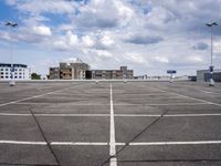 A straight line of infrastructure leads to the open space of a Berlin parking lot on a sunny day in Europe. Structures, asphalt, and parking decks blend with the background of clouds and contrails in the profile of this urban landscape.