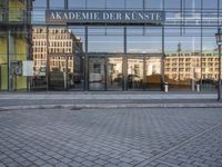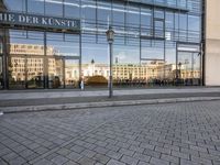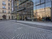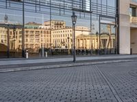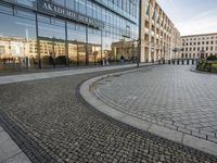 A snapshot of the classic architecture, urban design, and mixed-use infrastructure of Berlin, Germany. A line of vehicles and bicycles cruise down the cobble stone road, while a low tree and public plaza sit in the foreground against the backdrop of a glass walled building. On a clear day, tourists explore the metropolitan area, taking in the reflection of the town square, while enjoying the warm pavement and curb of the city.