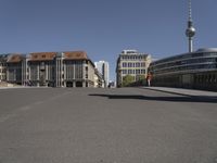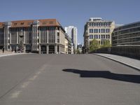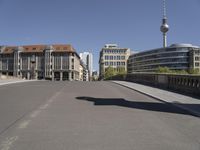 A view of the city of Berlin, Germany; a tourist attraction known for its modern architecture, mixed-use residential areas, urban design, public spaces, infrastructure, museums, palaces, and town squares. The clear sky reveals a low road with buildings and a bridge in the distance, showing the city life and urban landscape of the European city.