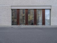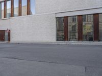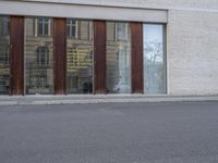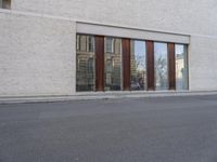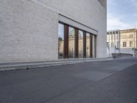 A bicyclist rides down a brick-lined road in the city of Berlin, Germany. A gallery, office building, and museum line the street, providing a glimpse into the modern architecture of Europe's urban landscape.