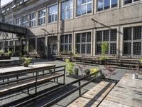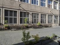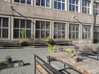 A classic Land Rover Defender parked in front of a colorful graffiti wall in a Berlin apartment complex's courtyard. The cobblestone driveway and yellow wood bench create a beautiful contrast to the city's industrial architecture and urban design.