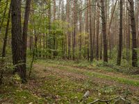 A winding road, full of gravel and sand, meanders through a deciduous forest showcasing the lush terrestrial plants, trees, and groundcover of Germany's capital city, Berlin, Europe in autumn.