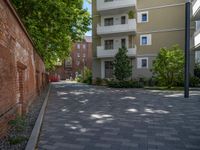 a paved brick street with red trash bins sitting in the middle and trees near to it