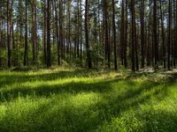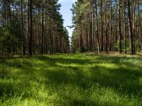 A dirt grass road leads straight down the road towards a lush forest landscape in Berlin, Brandenburg. The evergreen and deciduous trees provide shade and vegetation, with roadside grass and groundcover. An incidental person can be seen in the profile, exploring the open space and wetland of this woody plant paradise.