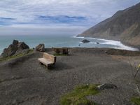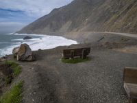 A recreational off-road track along the rugged terrain of Big Sur, California, USA, with an elevated view of the Pacific Coast Highway, a grey sky, ocean waves, shoreline, cliff, headland, promontory, and a tree in the foreground. Nature is seen in its most wild and open form here, with the mountain landforms and wilderness providing a calm and serene atmosphere.