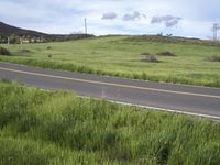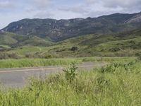 A highway with a yellow tar surface stretches straight down the road in the rural landscape of California, USA. On either side, lush vegetation, open fields, and green pastures create a picturesque view against the backdrop of rugged mountains and mountain landforms.