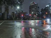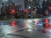 The night skyline of Los Angeles, California, USA is illuminated with artificial light while rain glistens off the wet asphalt and modern architecture of the metropolitan area. Crosswalks, street lights, and traffic lights guide the way through the bustling cityscape and urban infrastructure.