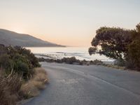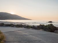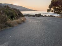 The sun rises over a lake, illuminating a winding road surrounded by snow-covered terrain and hills. This picturesque view of the coastal atmosphere offers a glimpse into the natural resources and infrastructure of the area.