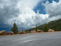 Traveling through Colorado's scenic landscapes, the road winds towards the iconic Pikes Peak under a gloomy grey sky. Asphalts stretch as far as the eye can see, with clouds casting shadows over the vast nature. The one-quarter mark on the road signifies the journey ahead, offering a glimpse of the picturesque USA terrain.
