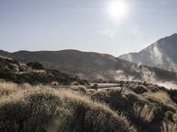 a winding winding road in front of an volcano on a sunny day with low clouds