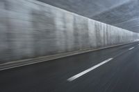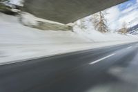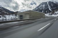 A motor vehicle driving along a controlled access highway in the European Alps, on a road trip through Germany and Switzerland in winter. The snow covered mountain range, with its reflection in the wet road surface, creates a picturesque atmosphere against the grey sky.