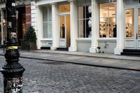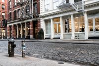 The morning light illuminates the classic architecture of the boutique shops and mixed-use buildings in the urban neighborhood of Greenwich Village, Manhattan, New York, USA. Tourists explore the public spaces, roads, and plazas, admiring the cobblestone road surfaces, storefronts, windows, doors, walls, and columns.
