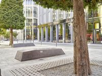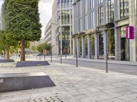 A man stands in the plaza in front of a mixed-use property in Hamburg, Germany. The city is a blend of modern and classic architecture, with a variety of shops, restaurants, and hotels. The clear sky illuminates the urban design, with a road surface, curb, and trees providing a pleasant public space to explore.