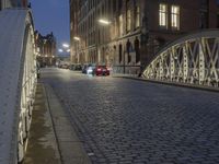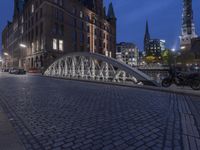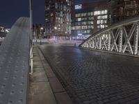 The classic architecture of Speicherstadt in Hamburg, Germany stands out against the backdrop of the metropolitan area, illuminated by the artificial light of the city. The cobblestone streets and the tie-arch bridge of the Deutschland river create a scenic urban landscape, with its steel and iron infrastructure and street lights creating patterns of light and shadow throughout the night.