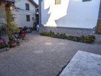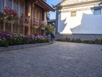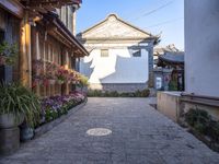 A cobble stone walkway leads through the residential area of the old town of Lijiang, Yunnan, China. The traditional architecture and hard shadows of the buildings, restaurants, and hotels create a classic and historic atmosphere for visitors of this popular tourist destination. The clear sky and elevated view of the vegetation, trees, and public spaces offer a unique perspective of the ancient Chinese village and its surrounding suburbs.