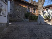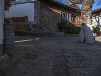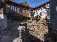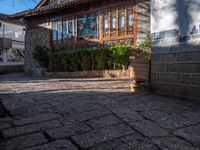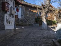 The cobble stone roads of Lijiang, an ancient town in Yunnan, China, lead past the residential buildings and classic architecture of the old village. The hard shadows of the trees and stone wall cast on the road surface create a profile of the old town's infrastructure in the clear sky. This suburban neighborhood is filled with restaurants, hotels, and other properties of real estate, inviting visitors to explore and eat out at the Shangri-La.