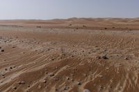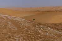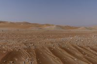 An off-road track leading through the rugged surface of the Liwa Desert in the United Arab Emirates, with clear blue skies and the Aeolian landforms of the ergs, wadis, dunes and makhtesh on the horizon.